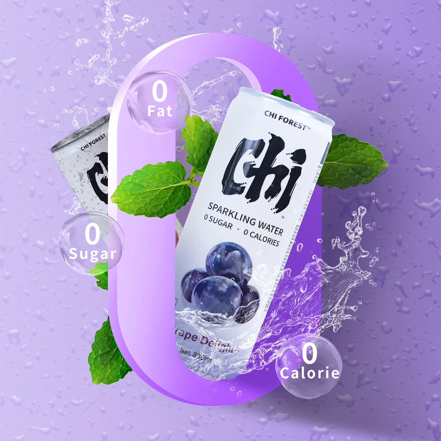Chi Forest Sparkling Water,Caffeine free,Gluten free,Vegan,0 sugar,0 calories,Grape Delight Flavor,11.16 Fl oz,24 Cans